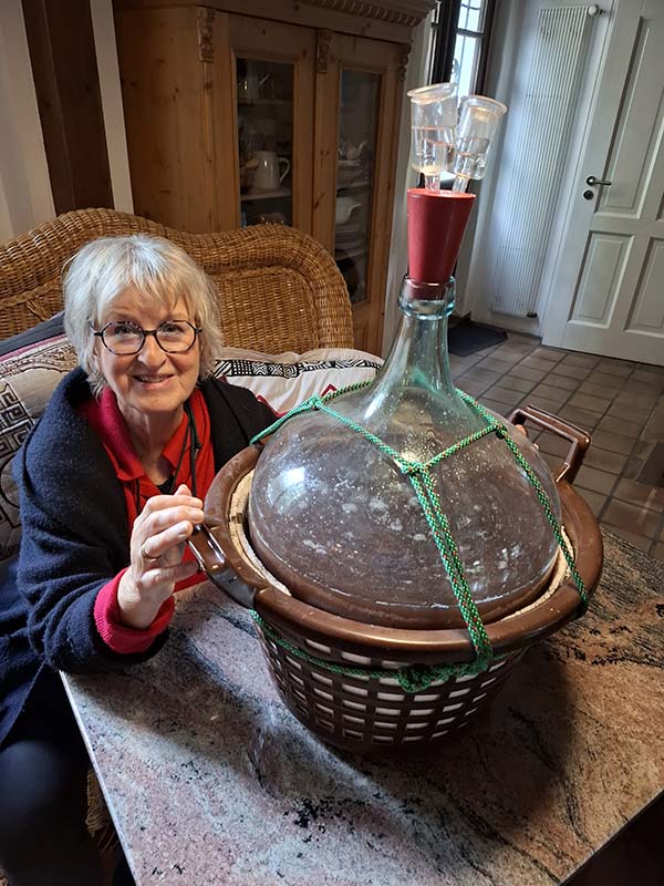 Die kostbare Flüssigkeit füllte diesmal nur einen 25-Liter Ballon und wurde mit Burgunderhefe versetzt. Diese tat ihre Wirkung, und nach mehreren Tagen entschied die Familie Wilms, wann der 2025-er Federrote zur Verkostung fertig sei. Damit mit aus dem ehemaligen Traubensaft kein „Oberwinterer Fratzenschneider“ wird, ruhte das Getränk im Kühlschrank.