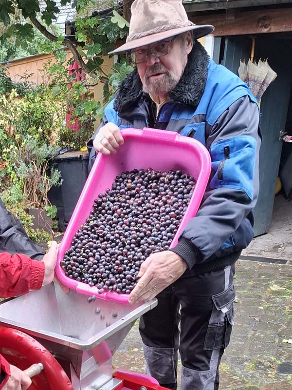Im Hof und im Garten unter Zelt und Markisen saßen weitere fleißige Menschen auf Gartenstühlen und Bierbänken, befreiten die Früchte von den Stielen und sortieren sorgfältig die süßen roten Trauben aus. Als weitere Schritte standen dann das Zermahlen und das anschließende Auspressen der Früchte an. Die uralte Presse wurde von Hand bedient – das kostete Kraft und wurde von mehreren Helfern nacheinander gemacht.