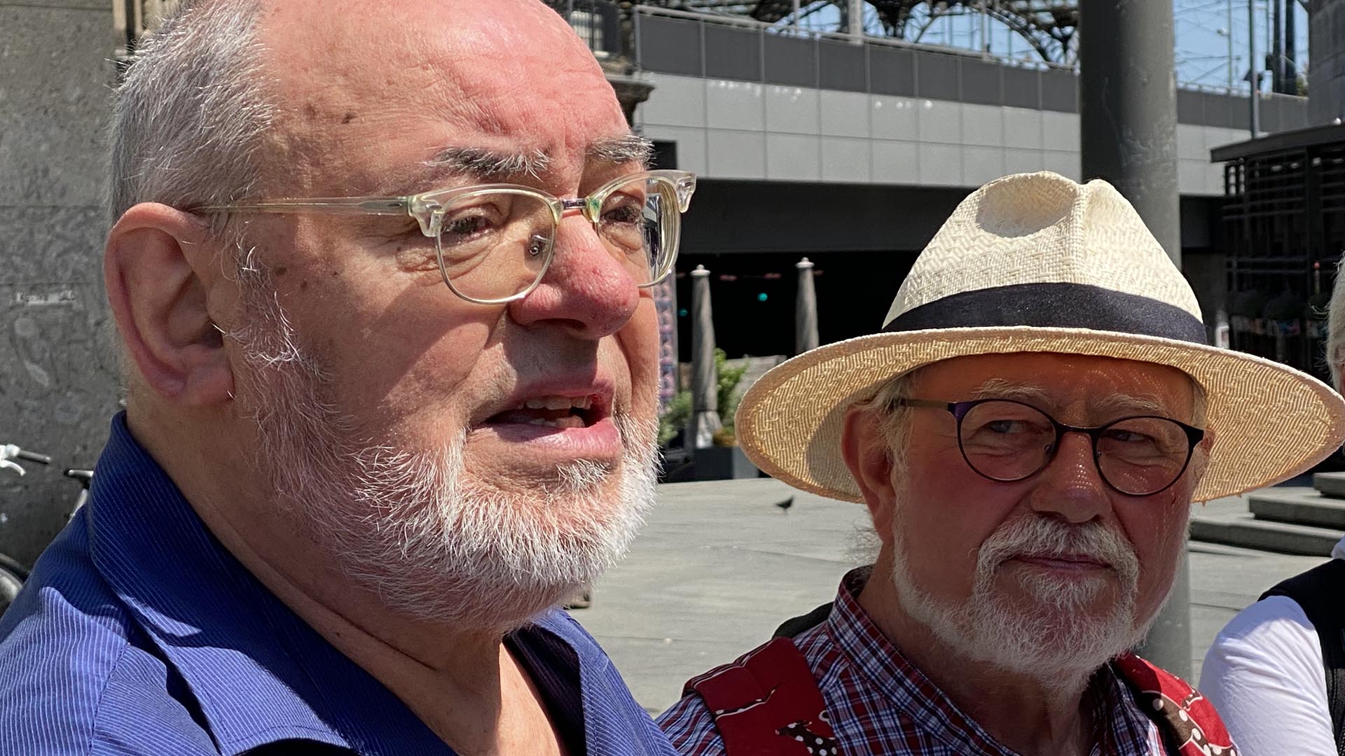 Hans Metternich, Vorsitzender des Rathausvereins Oberwinter, zusammen mit Udo Giesen, dem Vorsitzenden des Fördervereins zur Rettung der MS Stadt Köln, auf dem Ratsschiff im Kölner Rheinauhafen.