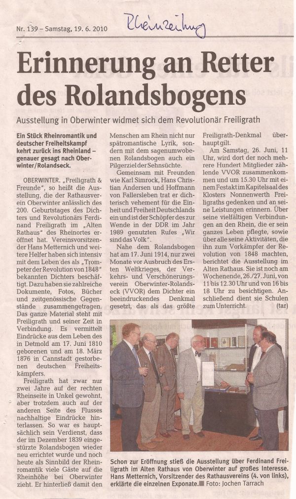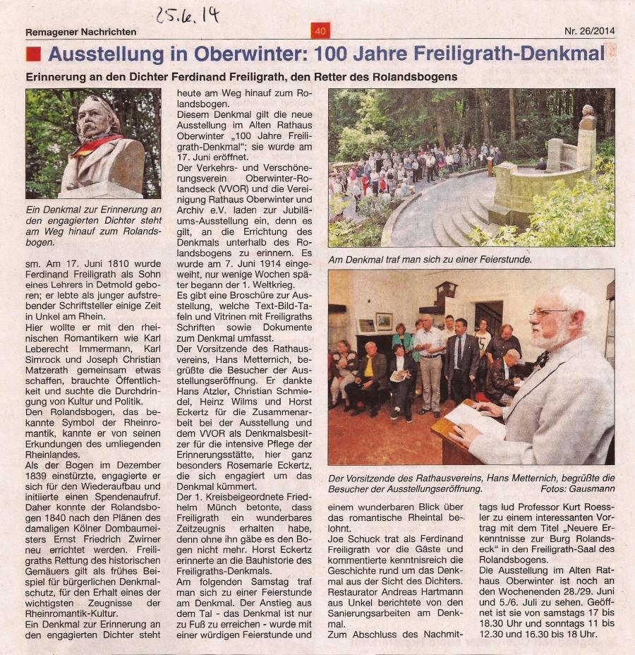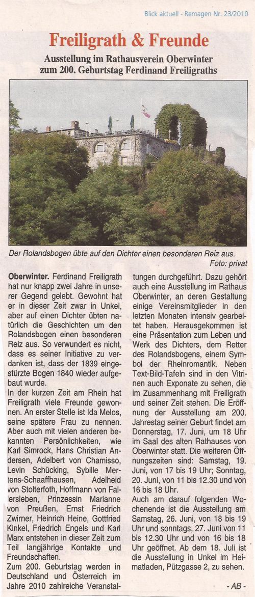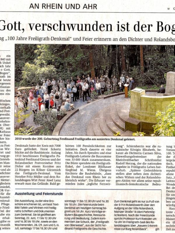 Ausstellung in Oberwinter: 100 Jahre Freiligrath-Denkmal